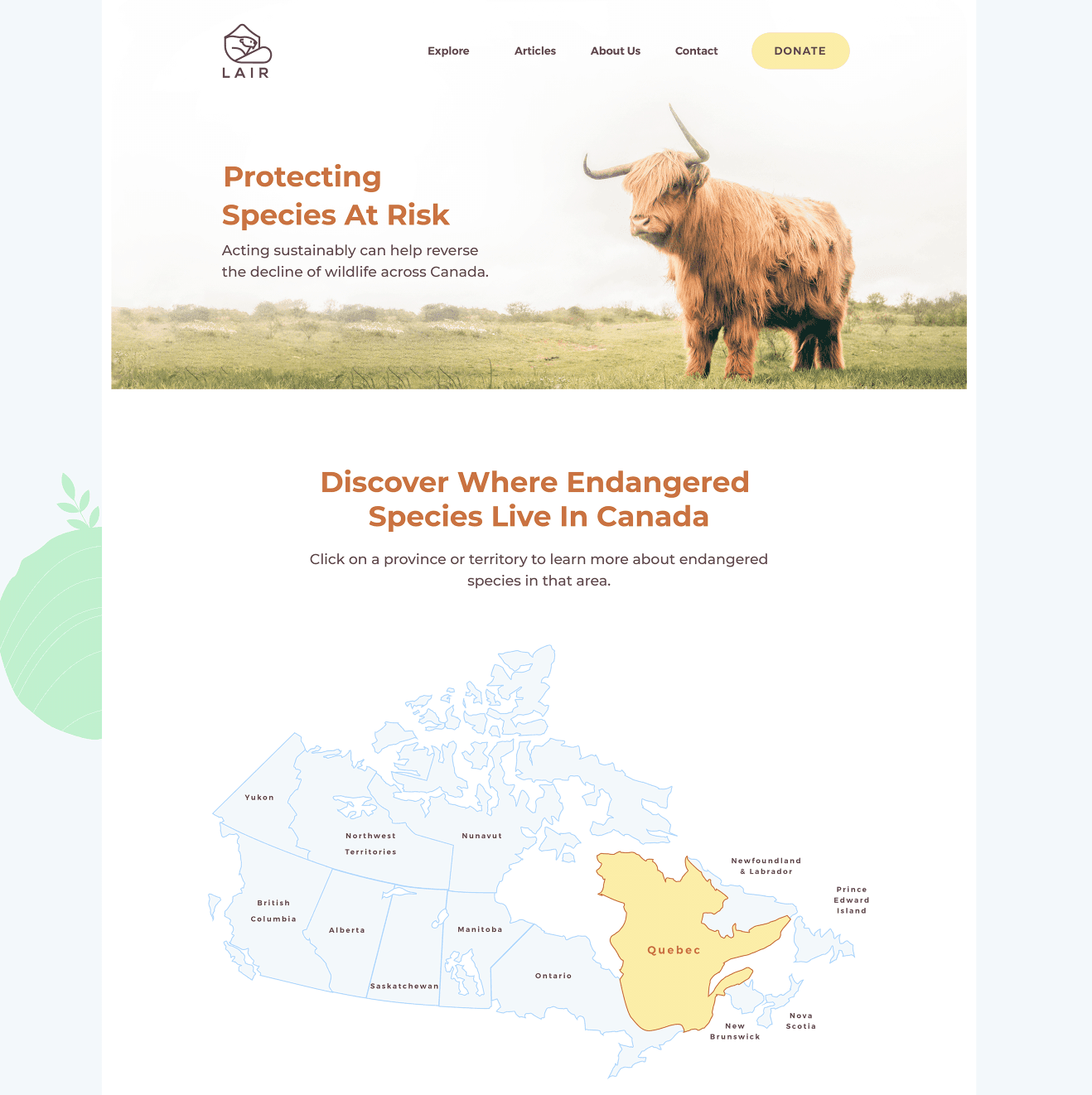 Lair is a responsive and data-driven web application, that provides information about endangered species in Canada. The data is displayed and analyzed through an interactive map and chart, which will encourage users to discover their local threatened animals. This online platform will also let the user take an active and meaningful role in providing relief to the wildlife and natural ecosystems of our planet.